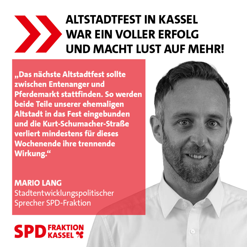 Mario Lang, Sprecher für Stadtentwicklung der SPD-Fraktion, regt in diesem Zusammenhang an: „Das nächste Altstadtfest sollte zwischen Entenanger und Pferdemarkt stattfinden. So werden beide Teile unserer ehemaligen Altstadt in das Fest eingebunden und die Kurt-Schumacher-Straße verliert mindestens für dieses Wochenende ihre trennende Wirkung.“