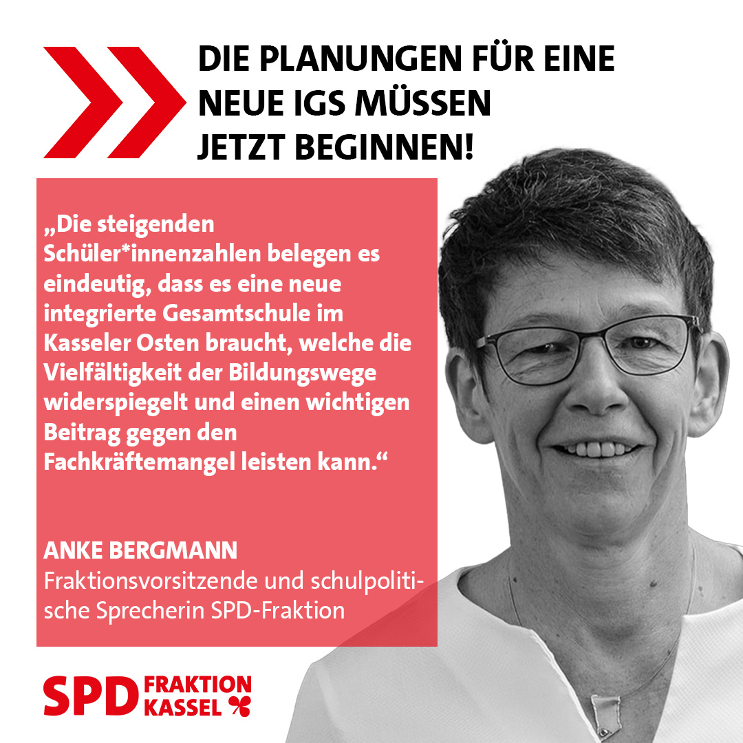 „Die Planungen für eine neue integrierten Gesamtschule müssen jetzt beginnen“, fordert die schulpolitische Sprecherin und Fraktionsvorsitzende der SPD-Fraktion Anke Bergmann: „Kassel muss nun endlich im Sinne des Schulentwicklungsplanes…