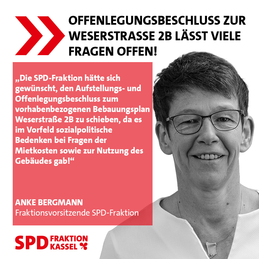 „Die SPD-Fraktion hätte sich gewünscht, den Aufstellungs- und Offenlegungsbeschluss zum vorhabenbezogenen Bebauungsplan Weserstraße 2B zu schieben, da es im Vorfeld sozialpolitische Bedenken bei Fragen der Mietkosten sowie zur Nutzung des…